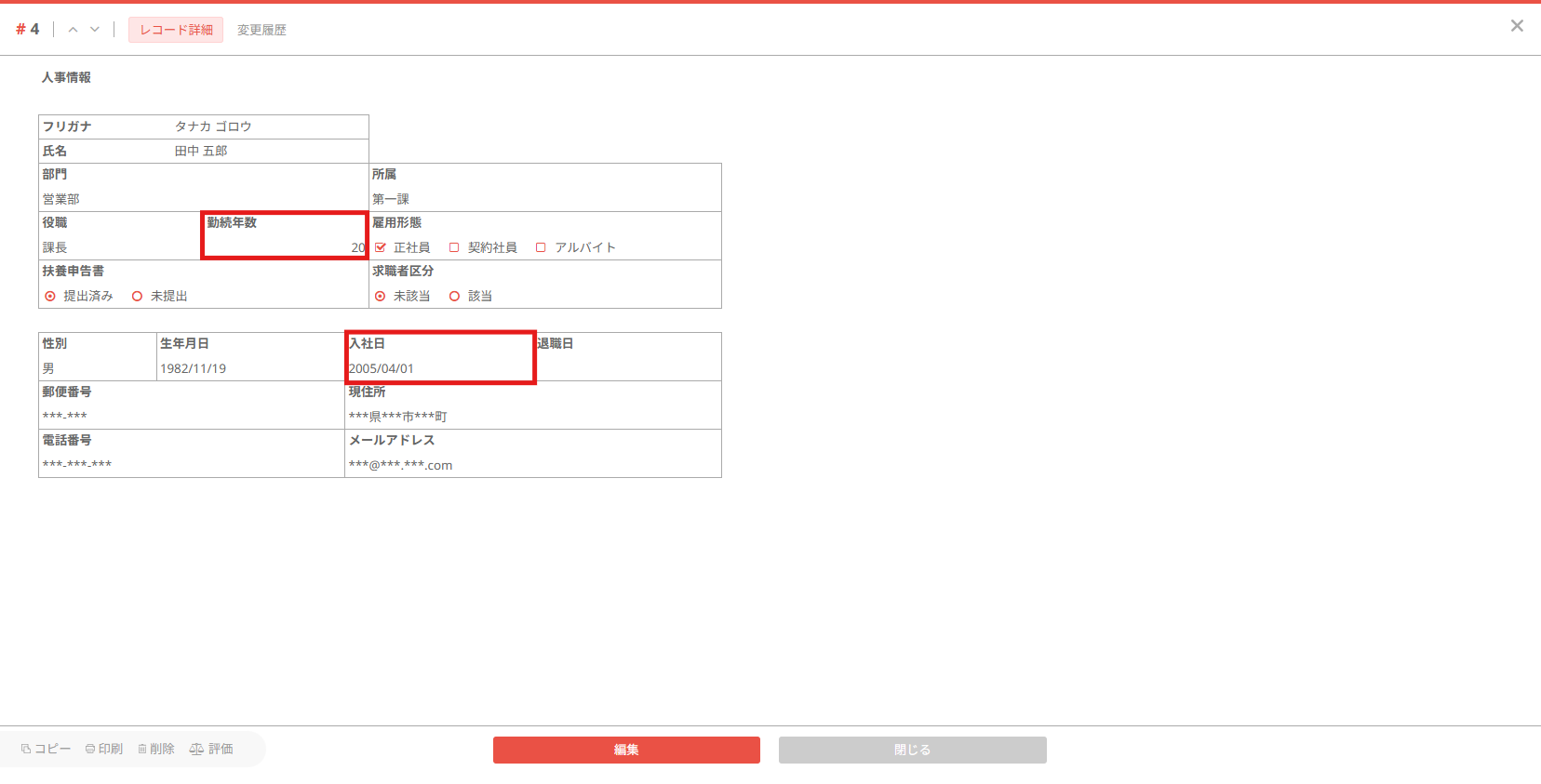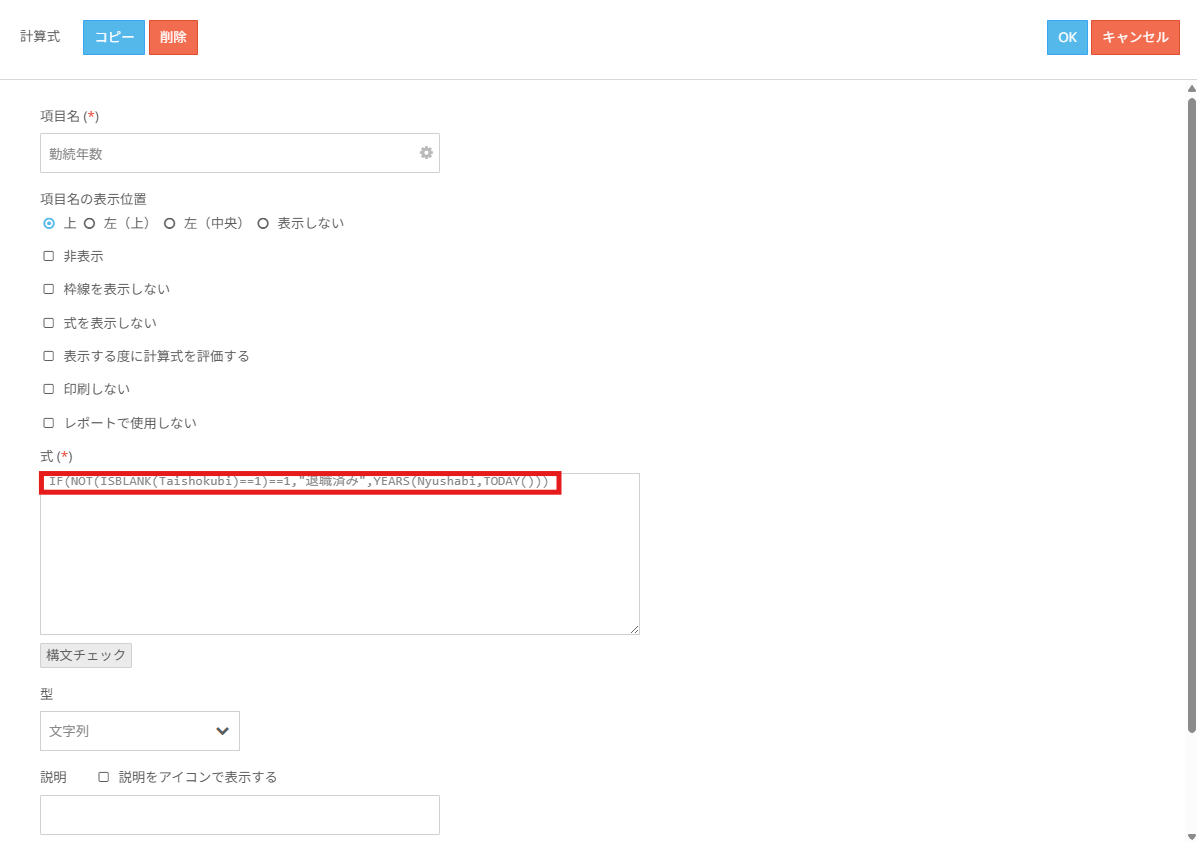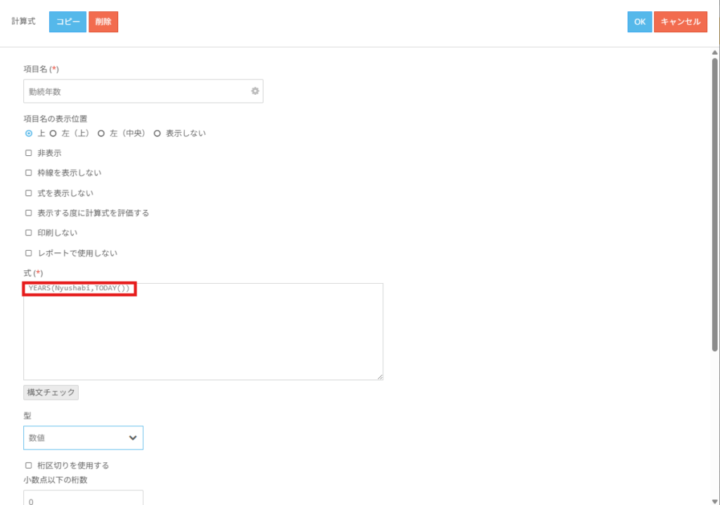 勤続年数を算出するため、開始日には入社日の項目ID(Nyushabi)を、終了日には現在の日付を返す関数TODAY()を記入します 。