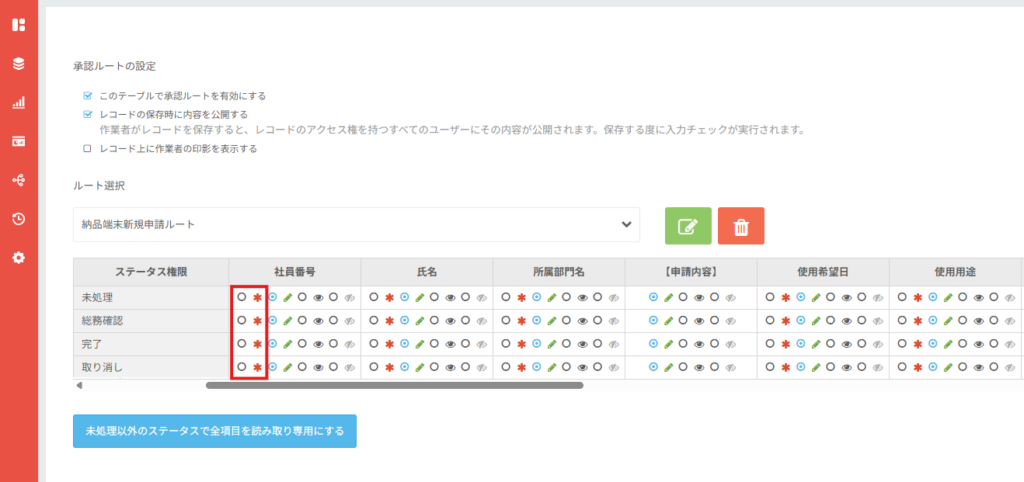 ルート管理画面を開くと、上記のように各ステータスに対する設定が表示されます。 社員番号の入力を必須にしたい場合は赤枠で囲まれている*にチェックを付けるとそのステータスにおいて入力必須となります。