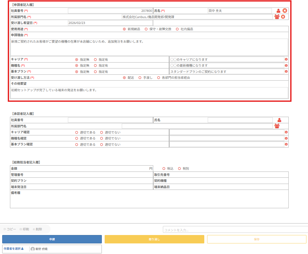 次の作業者はどの項目を入力すればよいのかがわかりやすく、申請時同様入力漏れの心配もございません。