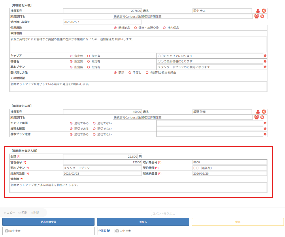 総務に申請されたレコードでは、総務担当者入力欄の項目が入力必須になっています。
