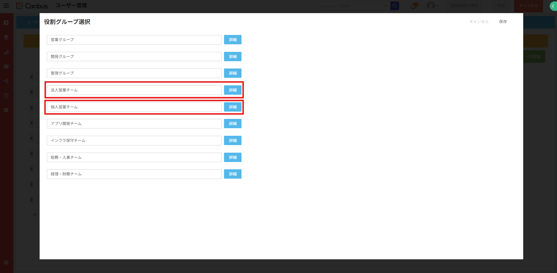 今回の場合は、法人営業チームと個人営業チームを選択します。